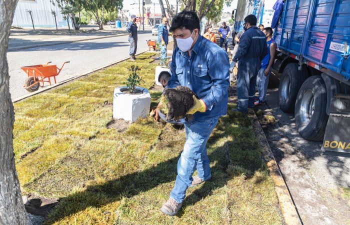 Comenzaron a colocar el césped en los boulevares de avenida Kennedy